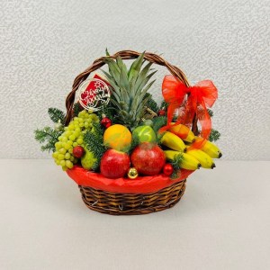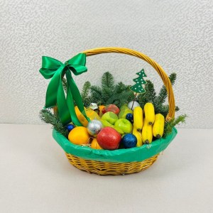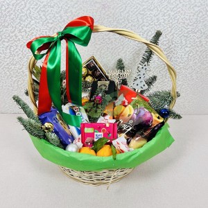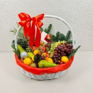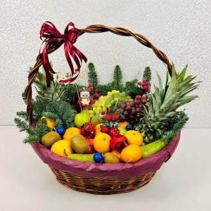 Корзины в подарок на Новый год и Рождество. Вы можете приобрести готовый вариант от наших флористов или выбрать содержимое (цветы, конфеты, фрукты или косметику) самостоятельно.