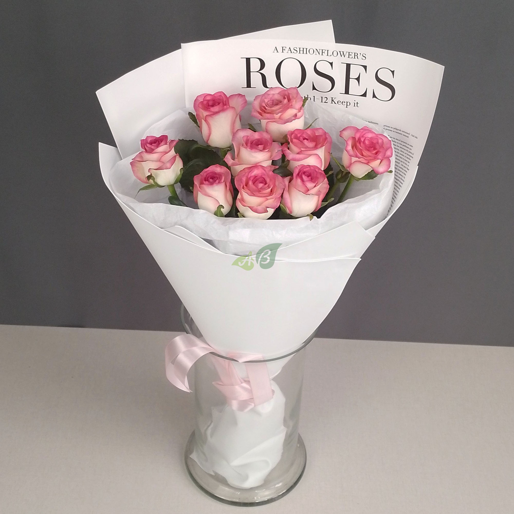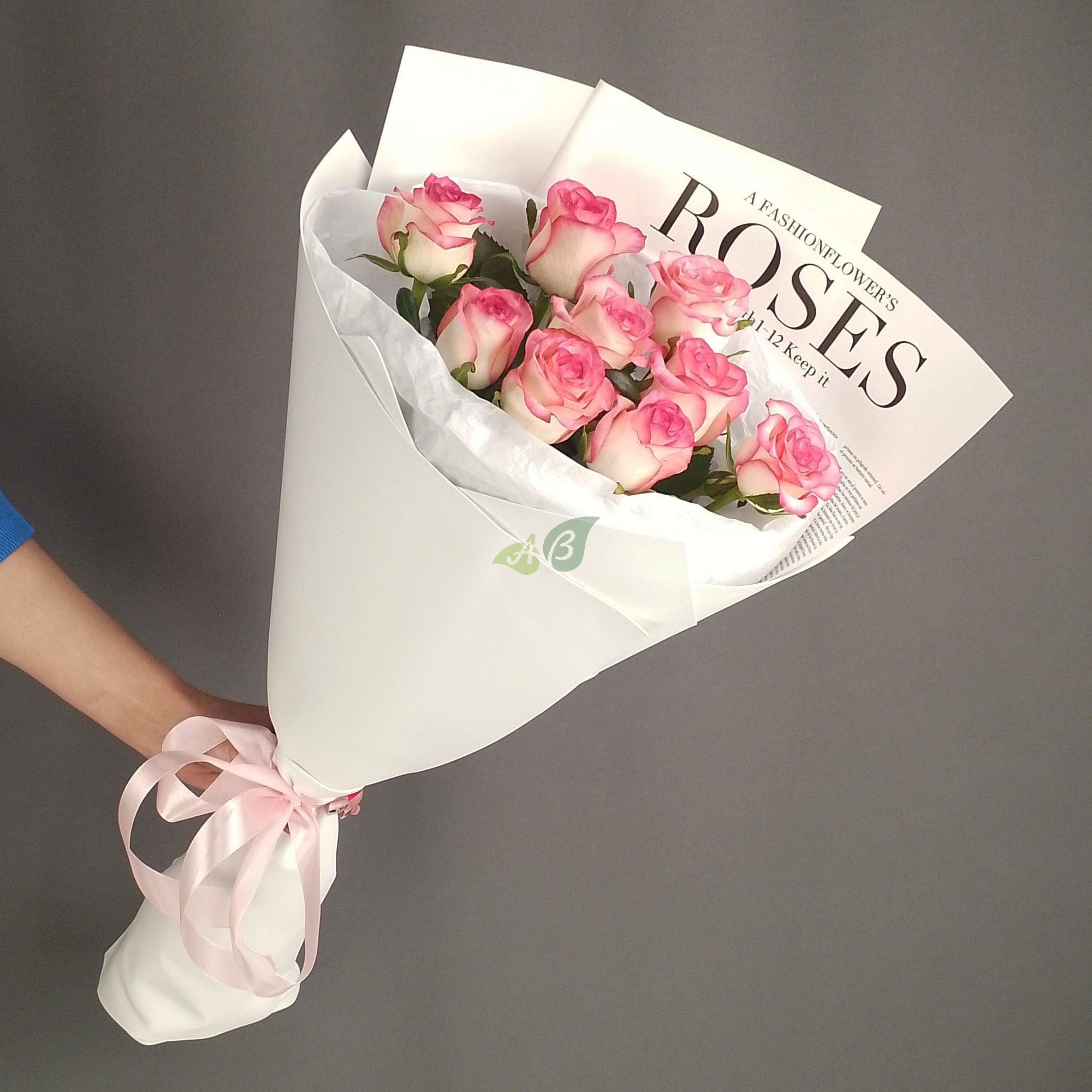 • Роза - 9 штук, цвет - бело-розовый, длина стебля - 60 см;