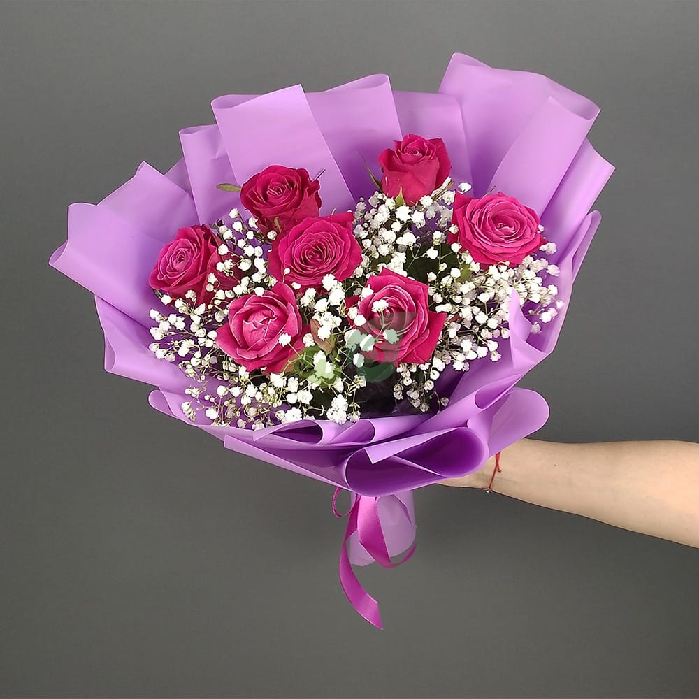 Букет из 7 розовых роз в сочетании с белой гипсофилой – это сама нежность. Его можно заказать для дочери на выпускной. Не стыдно подарить невесте на свадьбе. Эти цветы можно купить маме и сказать с его помощью, что вы ее очень любите.