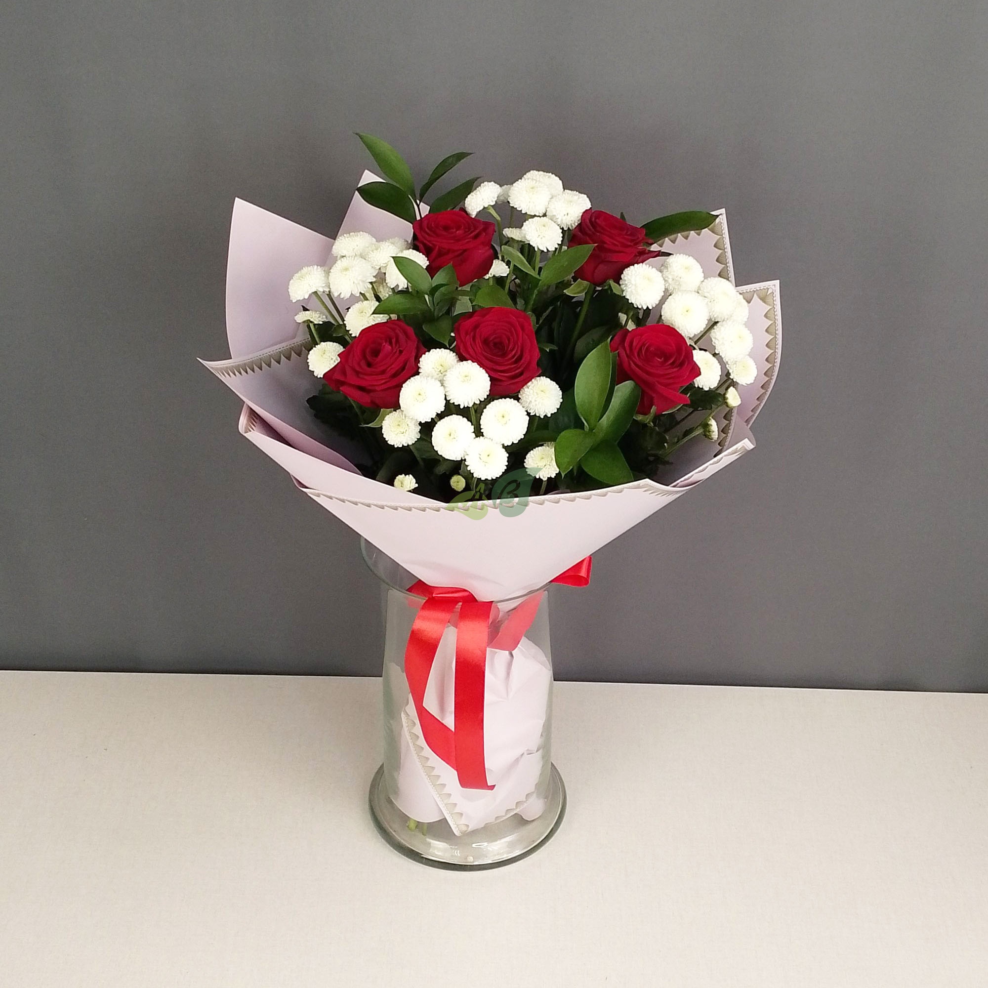 5 красных роз в сочетании с белой хризантемой и зеленью рускуса выглядит просто великолепно. Он говорит о вкусе дарителя, о том, что он ценит неповторимость того, кому предназначен этот букет.