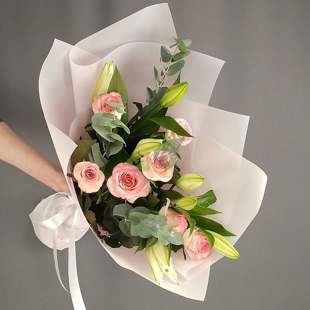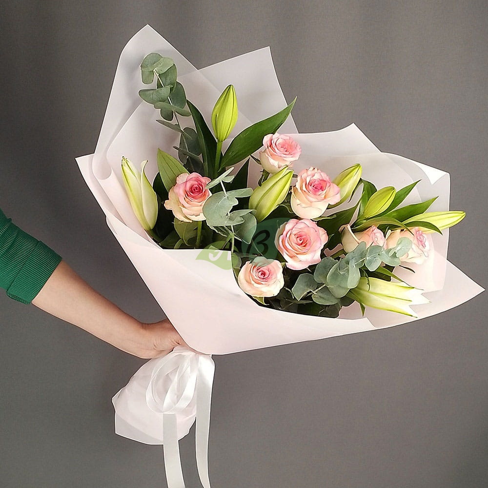 Состав и характеристики букета из роз и лилии "Прелесть":