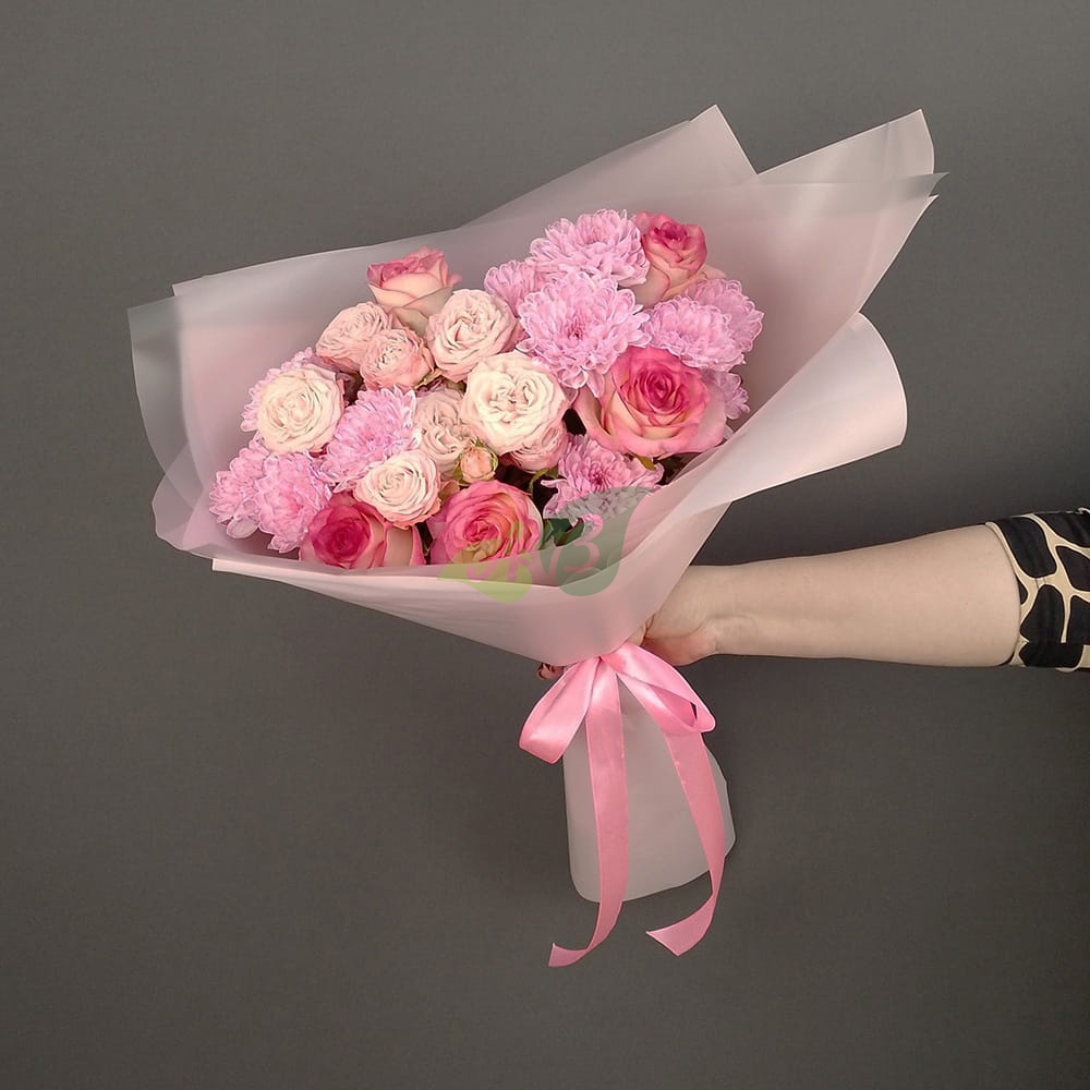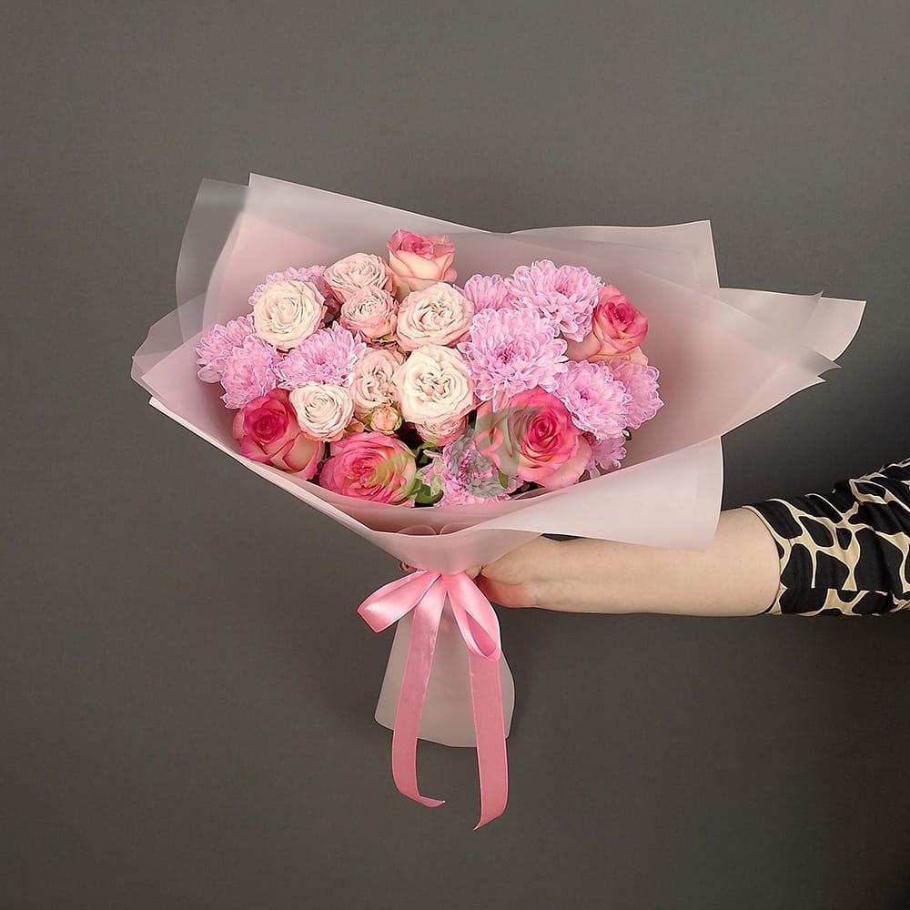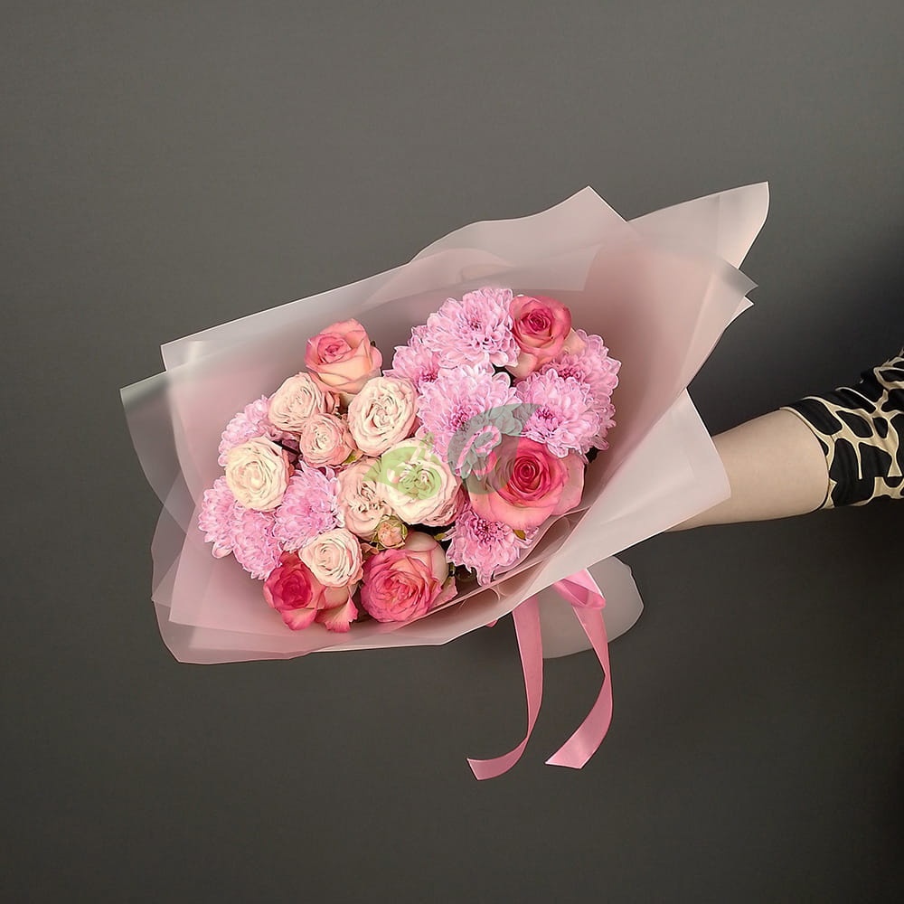 Состав и характеристики букета из кустовых роз и хризантем "Тёплые объятия":